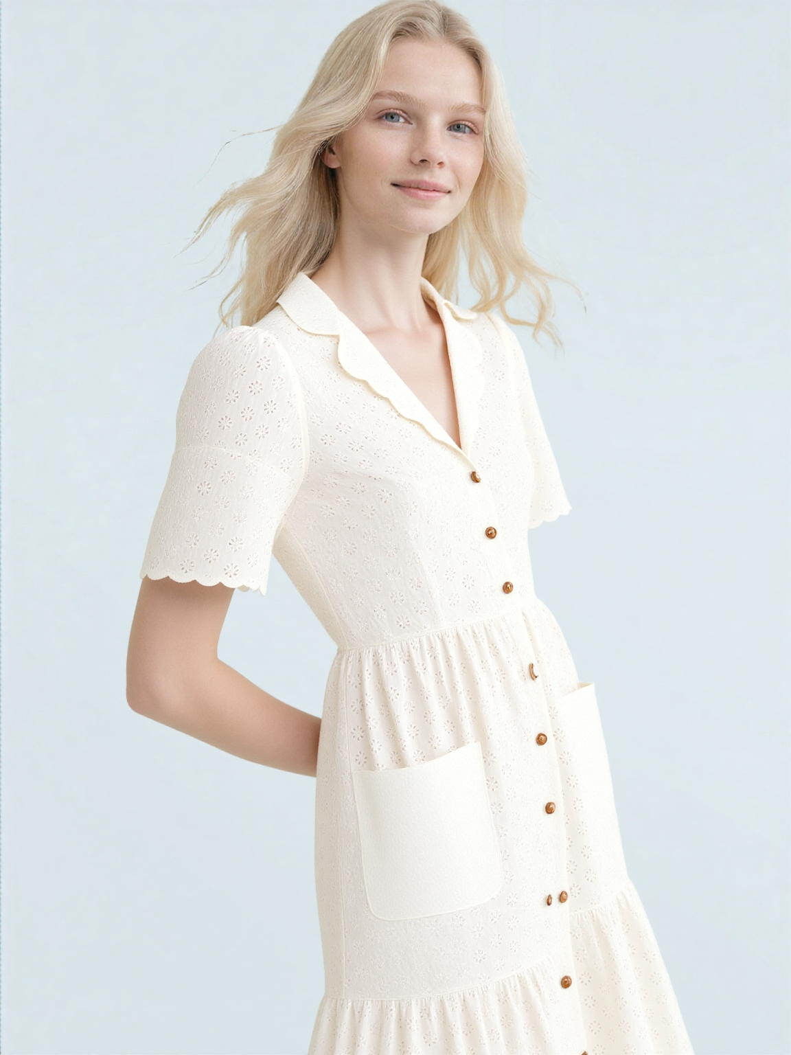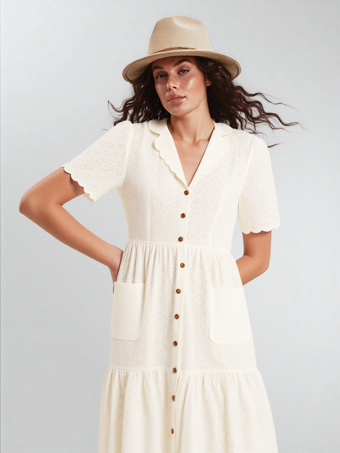 The Camille Day Dress is that rare piece that feels like summer, nostalgia, and fresh baguettes — all at once. With a scalloped collar, a flattering waist, and just the right touch of vintage, it’s made for mornings that begin at the market and afternoons that end with wine on the terrace. Crafted from airy organic cotton in textured seersucker or broderie anglaise, it buttons up with ease and cinches gently at the back with shirring for a perfect fit. It’s playful but polished. Romantic but relaxed. And it might just be your new everyday favorite.